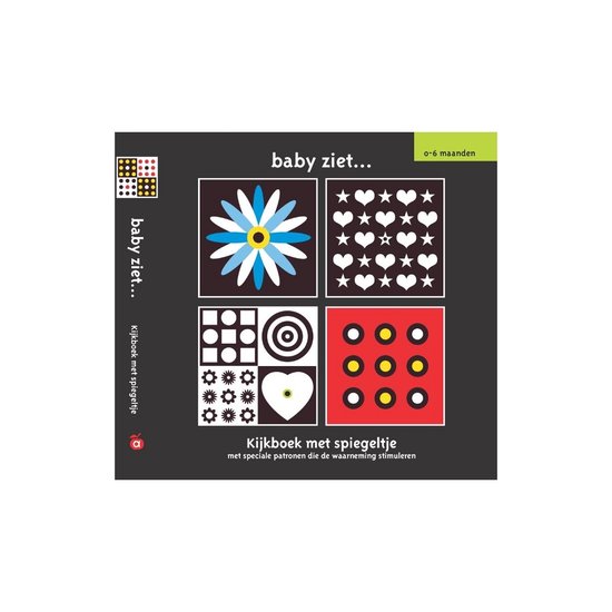 De reeks Baby ziet… is ondertussen al een beetje een klassieker. Het principe is eenvoudig: eenvoudige patronen in zwart-wit, hier en daar aangevuld met een felle kleur. Helemaal op maat van de waarneming van baby’s. Tekeningen die de hersenen en de visuele waarneming stimuleren! In dit nieuwe kijkboek staan weerom een heleboel leuke patronen. En als kers op de taart zit er achterin het boek een spiegeltje!